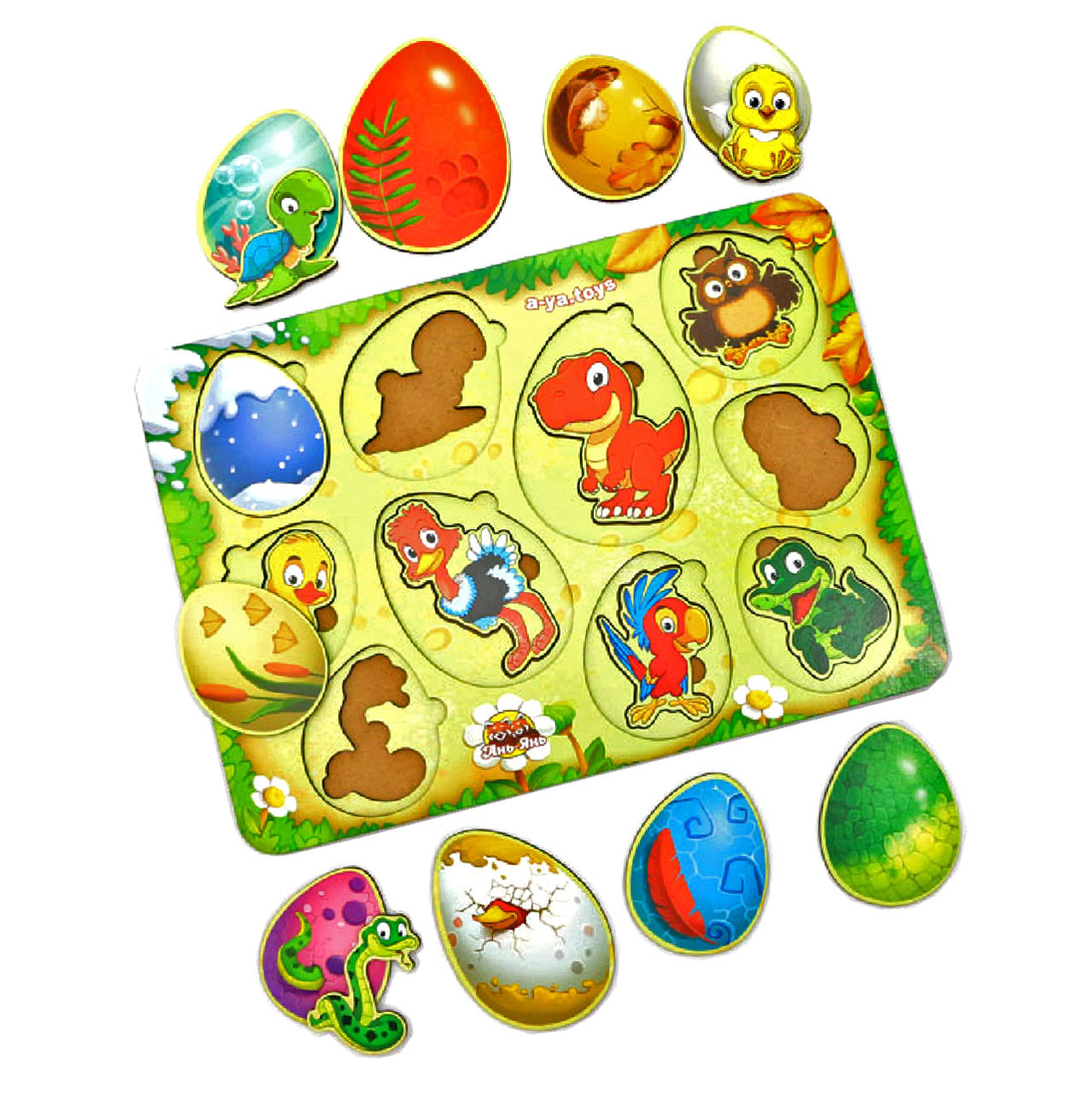 пазл сортер вкладиш Хто в яйці? , дерев'яна іграшка, Ань-Янь, 32 * 23 * 1 см, від 3 років, (ПСФ040) " Пазл-сортер складається з двох шарів: десять яєць, оформлена з дизайном підказкою для дитини (перешко пташки або хвостик змії) і шару з дитинчатами різних