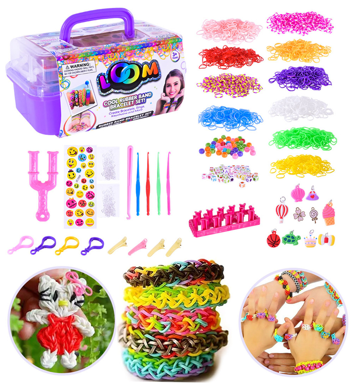 великий асортимент різнокольорових резиночок, намистин, станок та інструменти для плетіння, підвіски, заколки для волосся, наліпки, аксесуари для створення брелоків.
